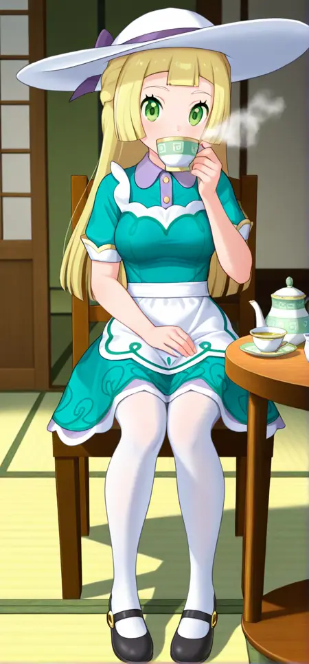 sclillie, sclillireg, green_eyes, blonde_hair, long_hair, sun_hat, white_headwear, hat_ribbon, green_dress, blue_dress, short_sleeves, collared_dress, apron, white_pantyhose, shoes, mary_janes, black_footwear