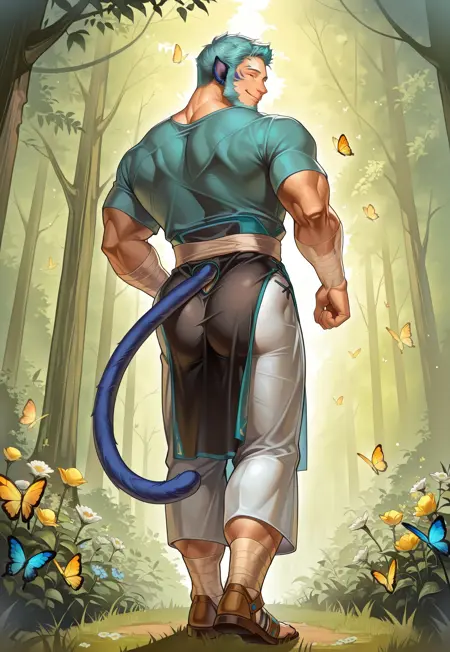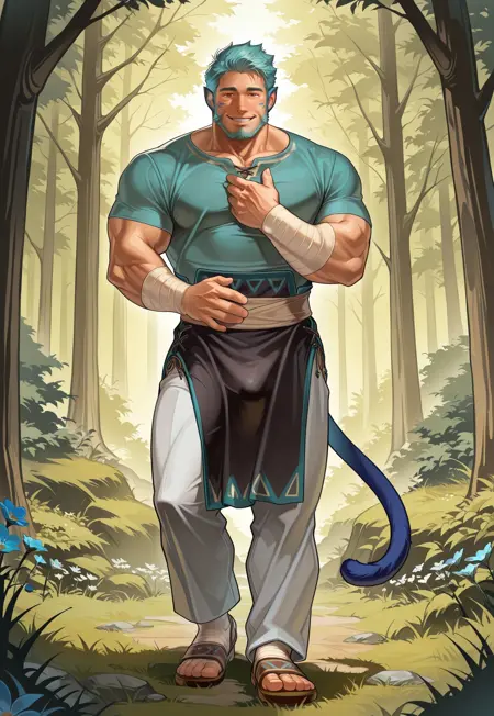 1boy, MordecaiFE, 水蓝色头发, 侧须胡须, 蓝色猫耳, 蓝色面部斑纹, 棕色眼睛, 绷带缠绕双臂, 水蓝色上衣, 米色绷带缠绕躯干, 白色长裤, 黑色矩形裆布配蓝色边框, 蓝色猫尾, 绷带缠绕双脚, 棕色凉鞋