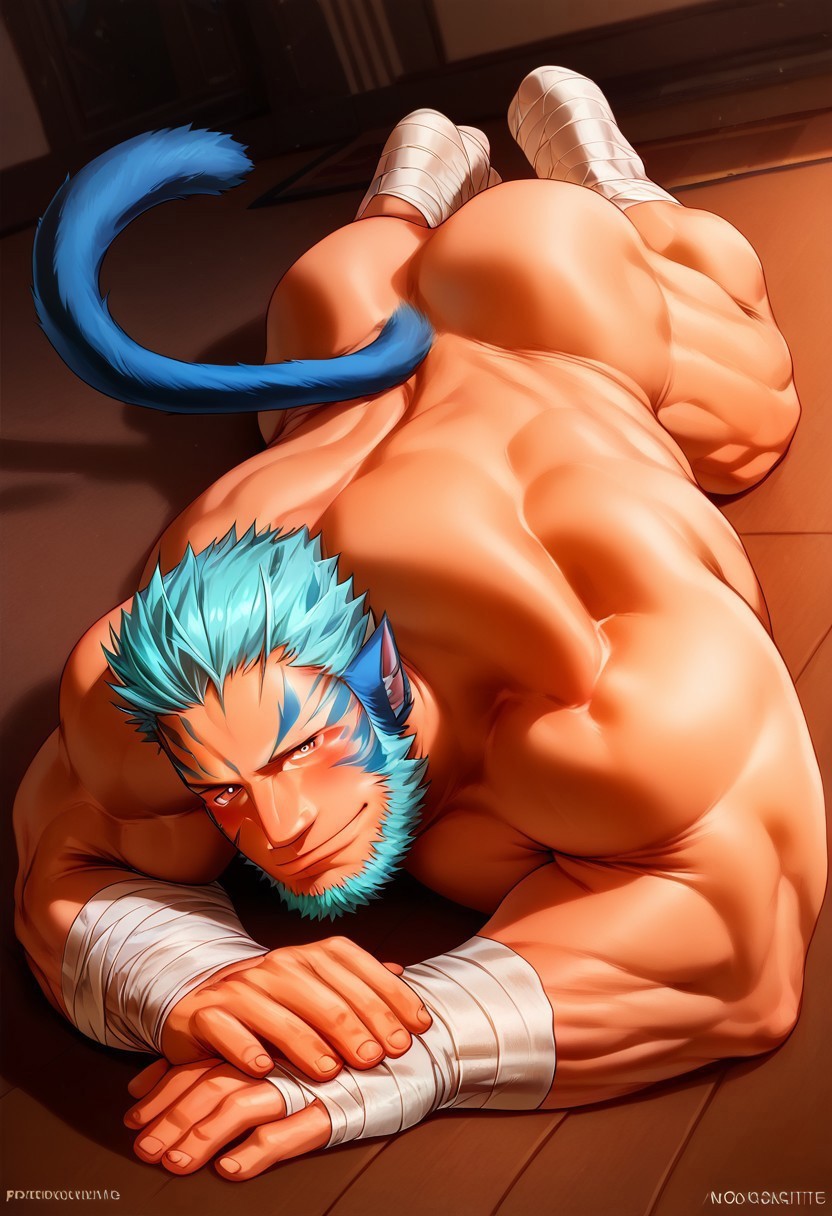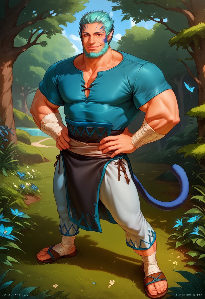 1boy, MordecaiFE, aqua hair, sideburns beard, blue cat ears, blue facial marks, brown eyes, bandaged arms, aqua shirt, beige bandages around torso, white pants, black rectangular loincloth with blue border, blue cat tail, bandaged feet, brown sandals