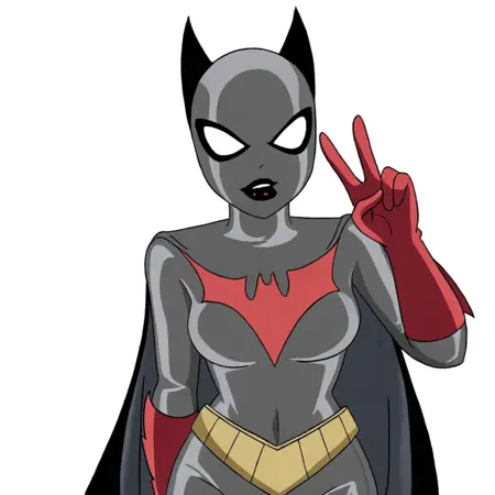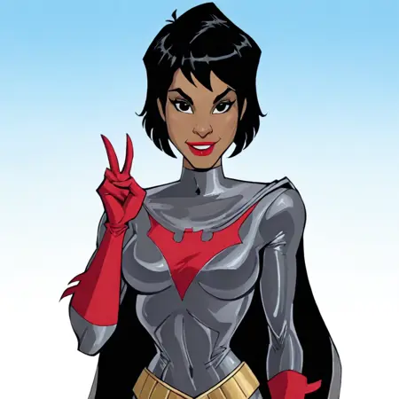蝙蝠女套装:kathydu, 1girl, solo, 深色皮肤, 短黑发, 黑色眼睛, 红唇, 红色手套, 灰色紧身衣, 灰色披风, 金色腰带