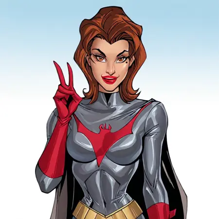 蝙蝠女套装:soniaal, 1girl, solo, 棕色头发, 棕色眼睛, 红唇, 雀斑, 红色手套, 灰色紧身衣, 灰色披风, 金色腰带