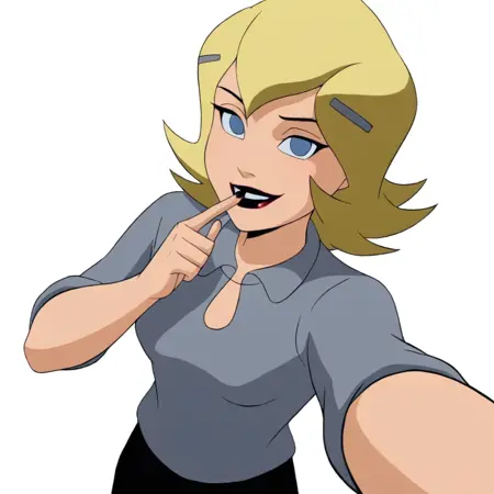 办公室装扮:rockybl, 1girl, solo, 金发, 蓝眼, 深红色嘴唇, 头饰, 灰色Polo衫, 黑色裙子