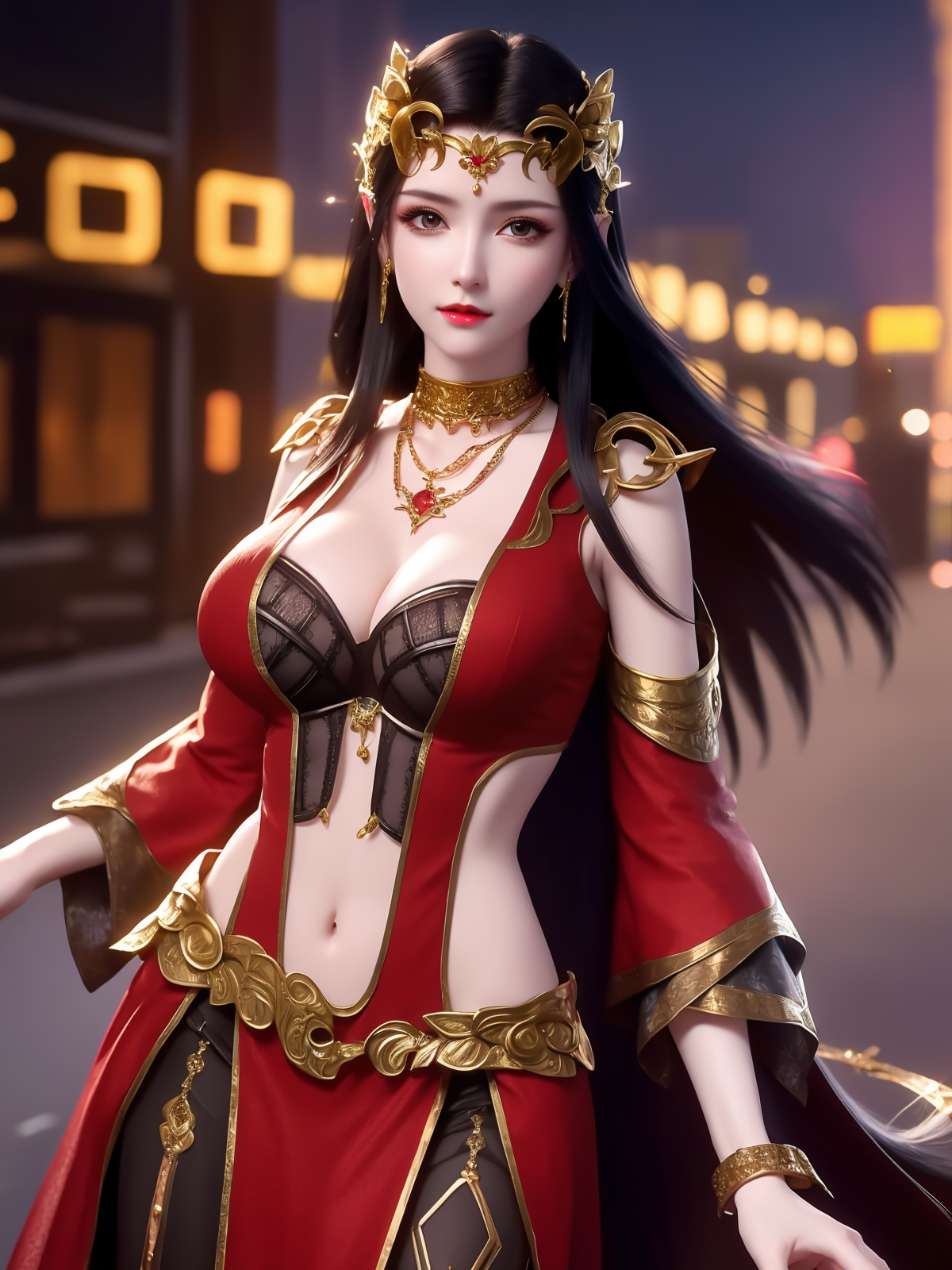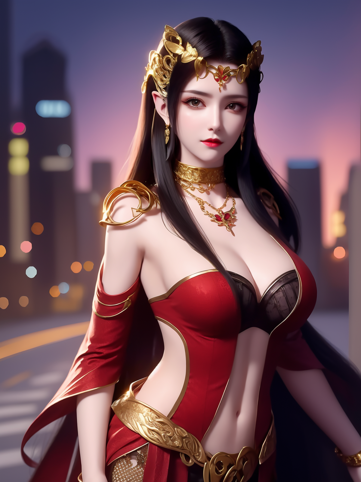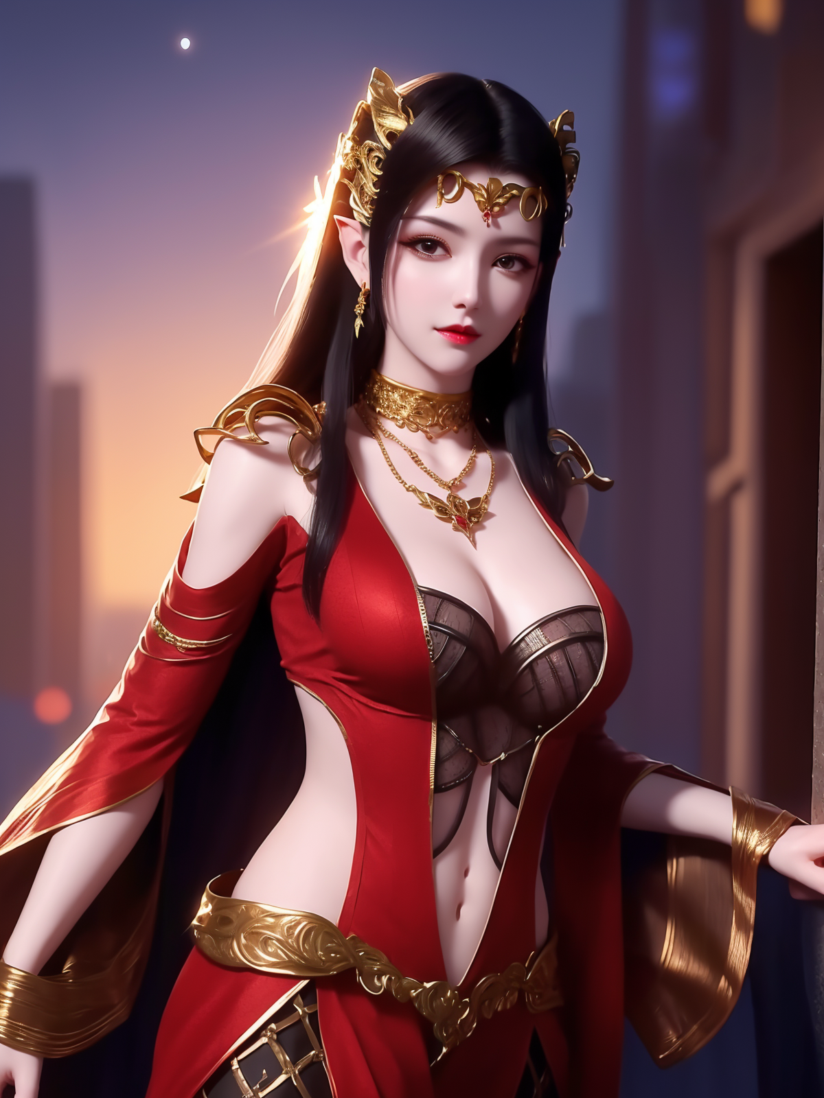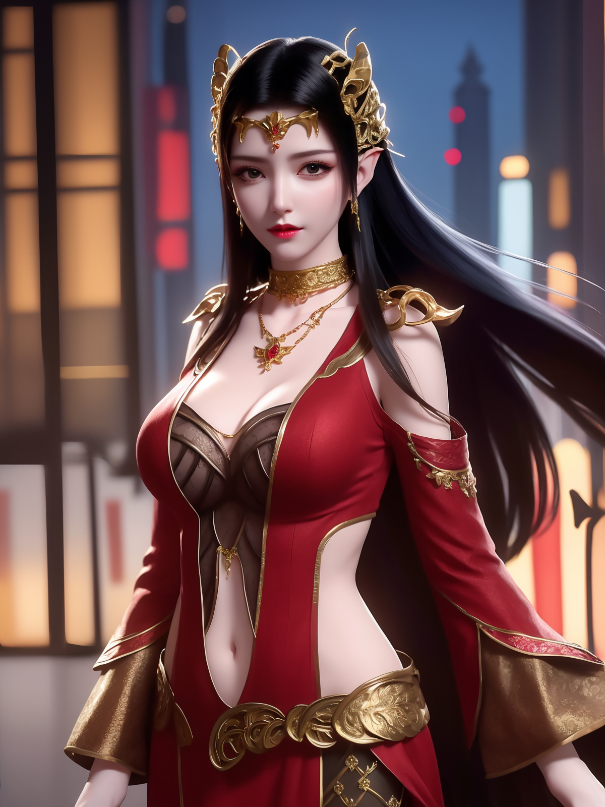- DPCQmeidusha, 1girl, solo, black hair, breasts, jewelry, dress, long hair, necklace, chinese clothes, navel, clothing cutout, medium breasts, cityscape, night, hair ornament,