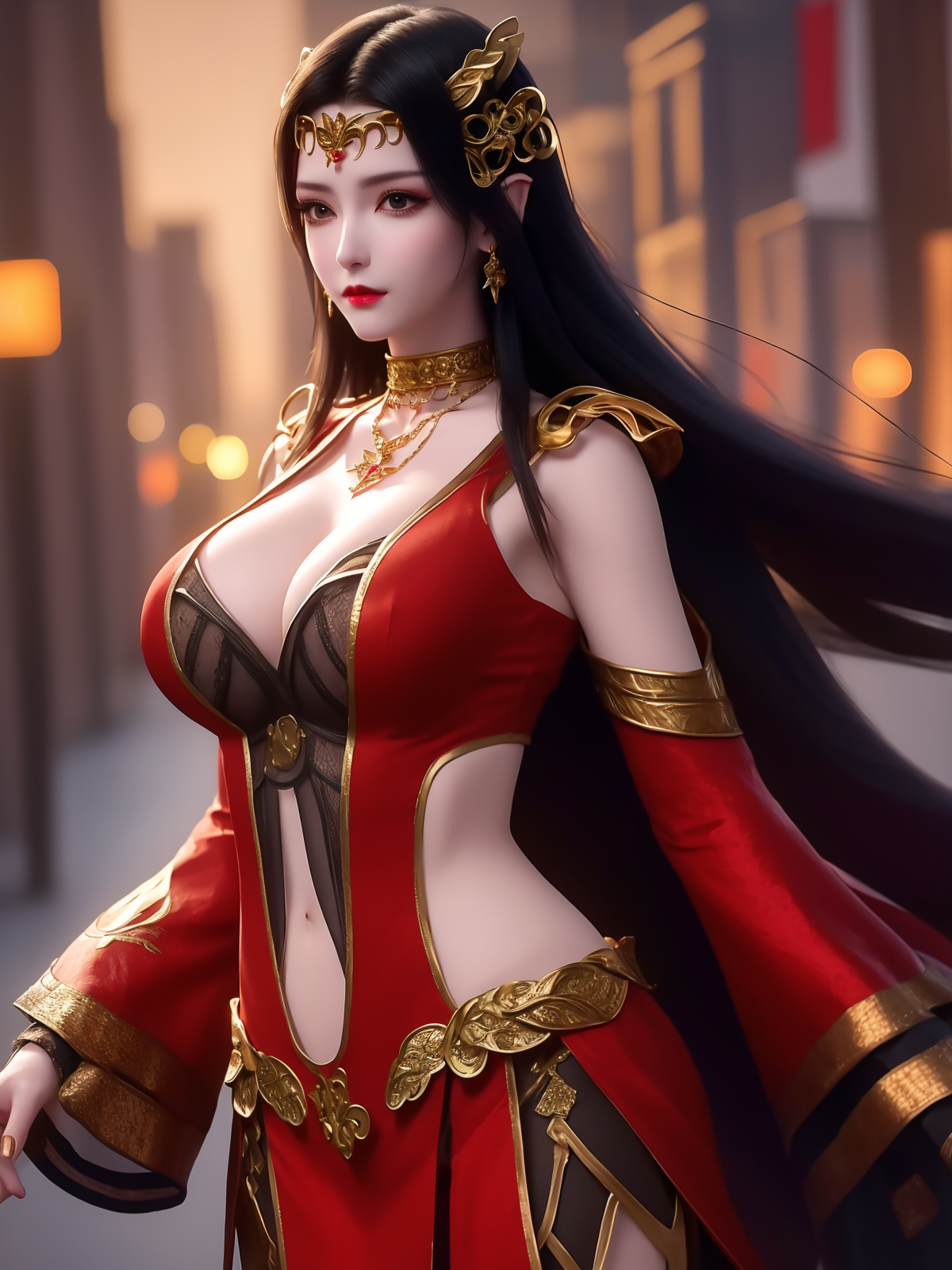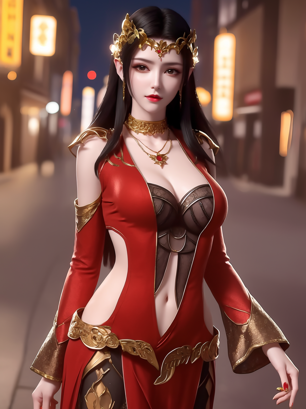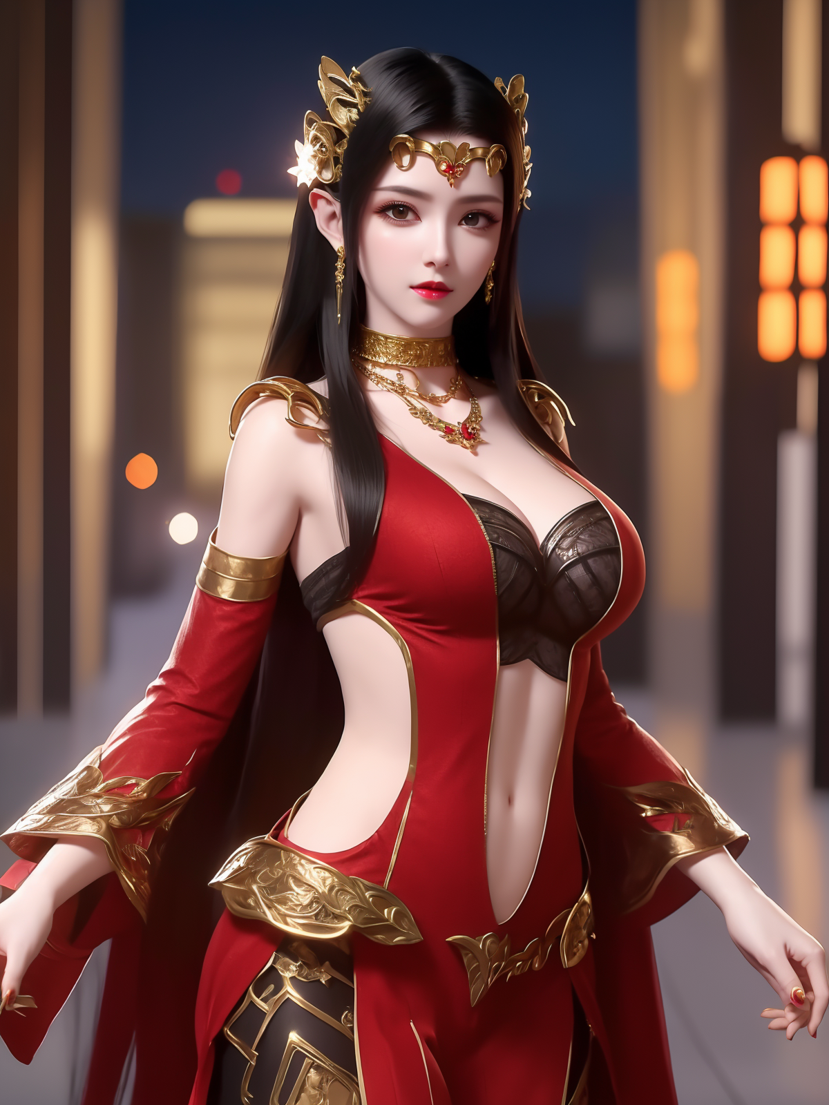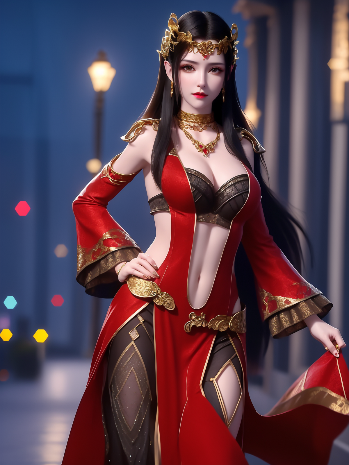 - DPCQmeidusha, 1girl, solo, black hair, breasts, jewelry, dress, long hair, necklace, chinese clothes, navel, clothing cutout, medium breasts, cityscape, night, hair ornament,