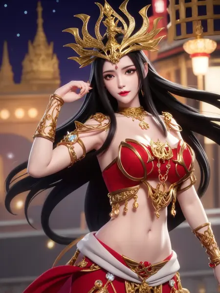 - 1girl, jewelry, long hair, hair ornament, necklace, navel, dress, forehead jewel, mature female, cityscape, night, looking at viewer,