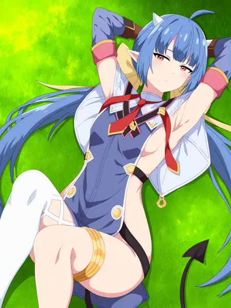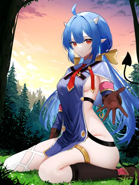 ravi \(epic seven\), blue hair, long hair, low twintails, ahoge, red eyes, pointy ears, demon girl, demon horns, hair bow, blue tabard, red necktie, sideless outfit, detached sleeves, capelet, asymmetrical legwear, single thighhigh, brown gloves, demon tail, sideboob, small breasts