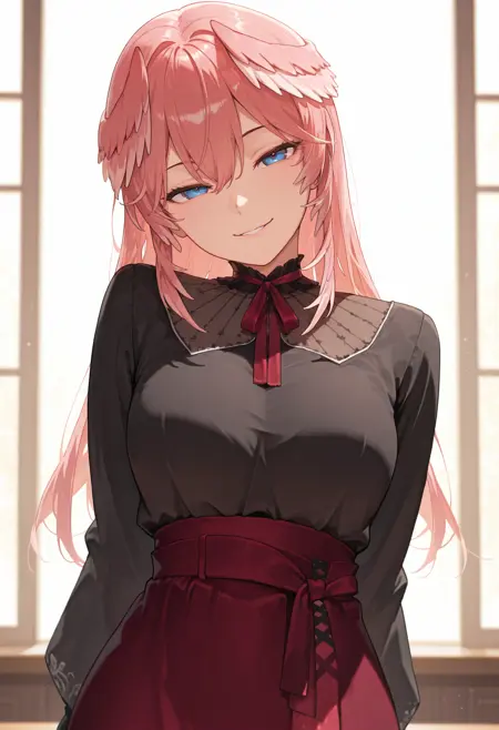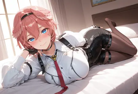 luidef, 頭の翼, 短髪, ヘアバンド, フワフワの長い袖, ポロシャツ, ウエスト高めのショートパンツ, 赤いネクタイ, フィンガーレスグローブ, 太ももストラップ, ショートパンツの下にパンティーストッキング,