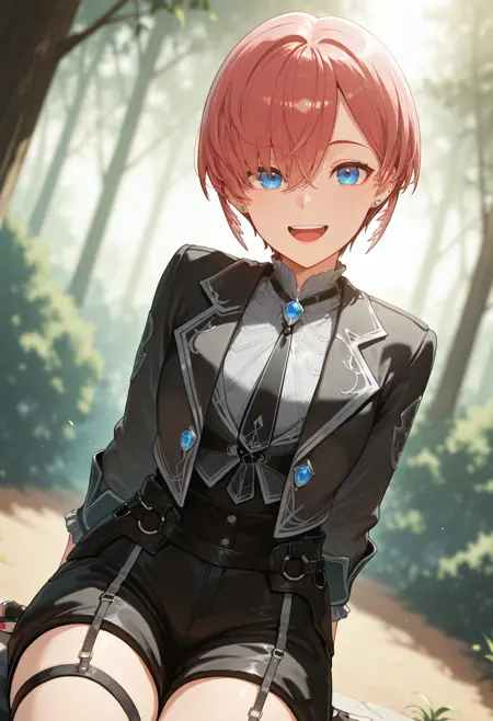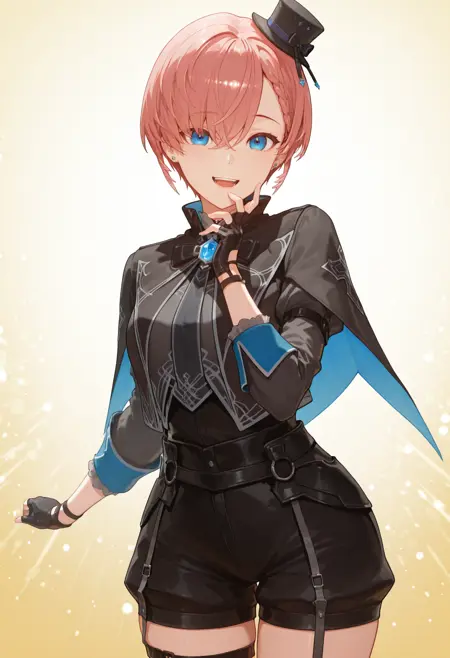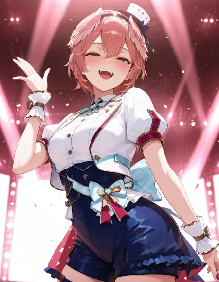 luiidol, 短髪, 青いショートパンツ, 短い袖, 腕輪, 白いシャツ, 頭の翼, 短いショートパンツ, 黒いヘアバンド, ボウタイ, フワフワの短い袖, フリル, 太ももストラップ,