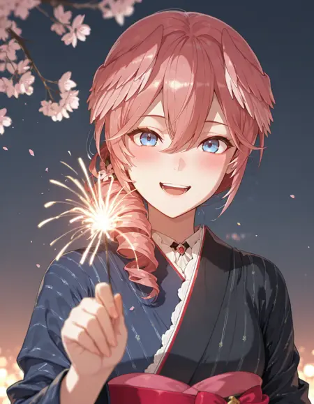 luinewyear, 長髪, 日本衣装, 青い着物, 黒い着物, 縦縞模様の着物, 目の間に髪, 頭の翼, 横ドリル,