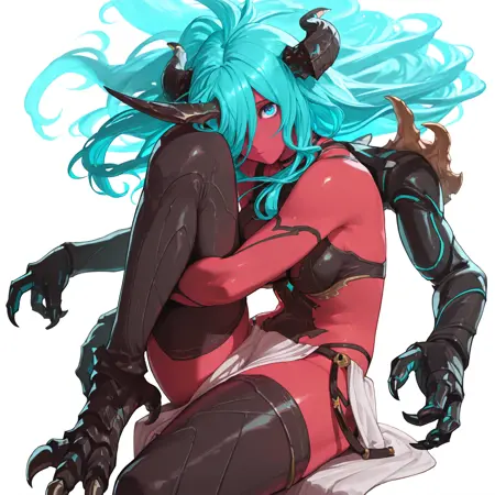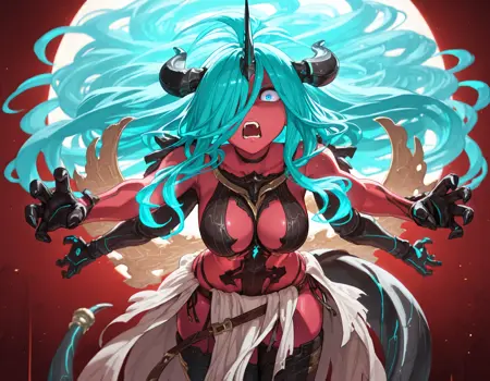 versusiail, 红色皮肤, 蓝色眼睛, 水色头发, 角,