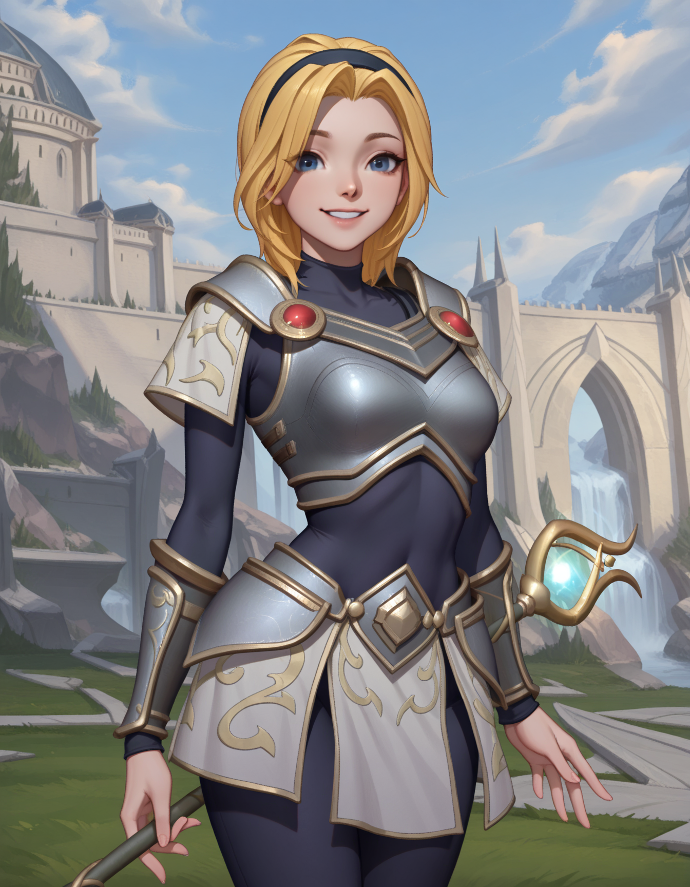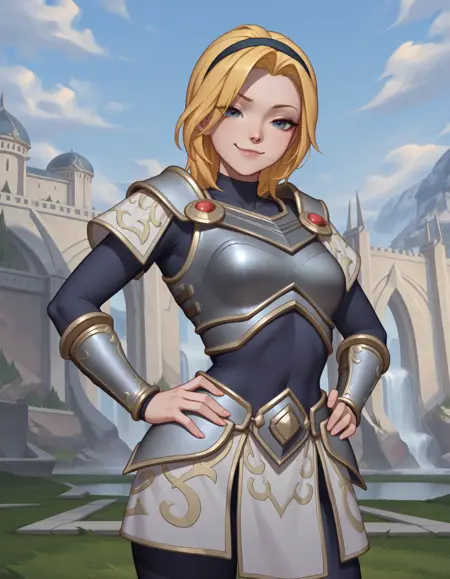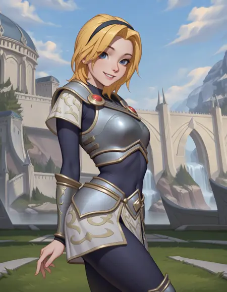 默认装扮:lux_lol_wr,金发,发带,蓝眼睛,紧身连体衣,盔甲,护臂,图案布料,短裙,装甲靴,