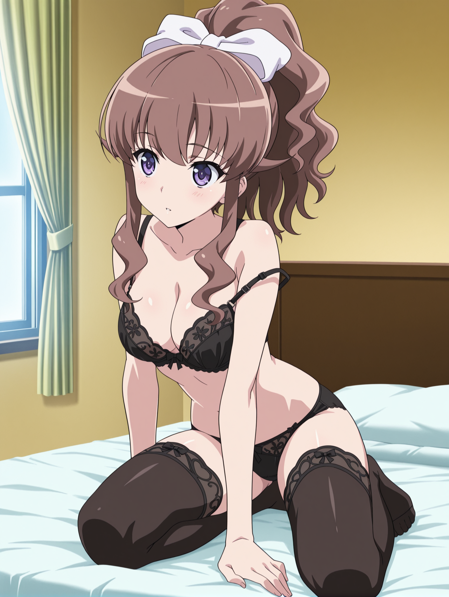 nagisa hanamiya, brown hair, purple eyes, bow, ponytail, school uniform, long hair, anime coloring, hair bow, bowtie, jacket, blazer