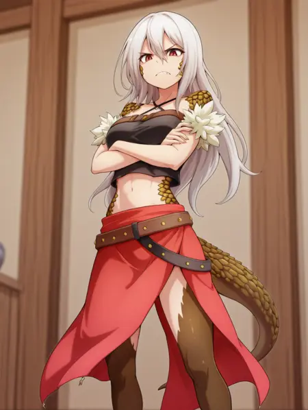 Miranda, white hair, long hair, red eyes, lizard girl, lizard tail, (scales), fur trim, (lizard legs), brown legs, black crop top, red skirt, belt,