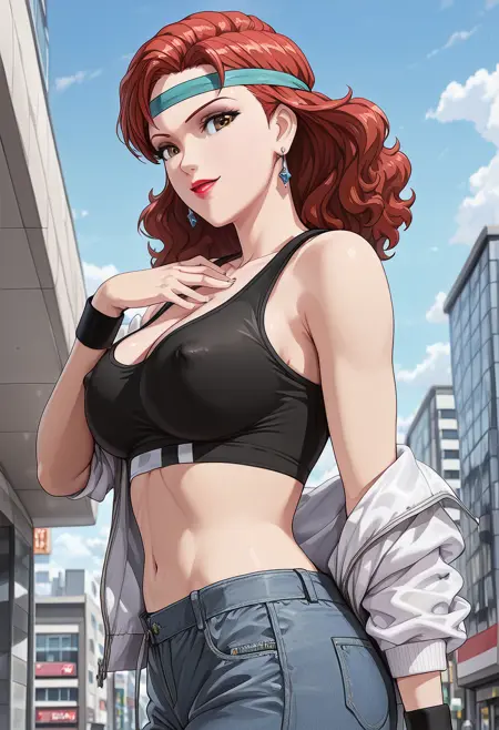 (검은 탱크탑, 흰 셔츠, 재킷, 벌어진 옷, 바지, 보석, 귀걸이, 검은 팔찌, 헤어밴드, 가슴 노출, 어깨 노출),