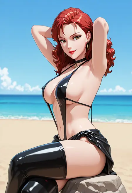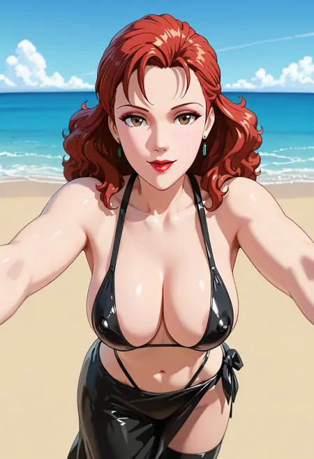 (가슴 부분 노출, 물결치는 머리카락, 붉은 머리, 갈색 눈, 붉은 입술, 메이크업),