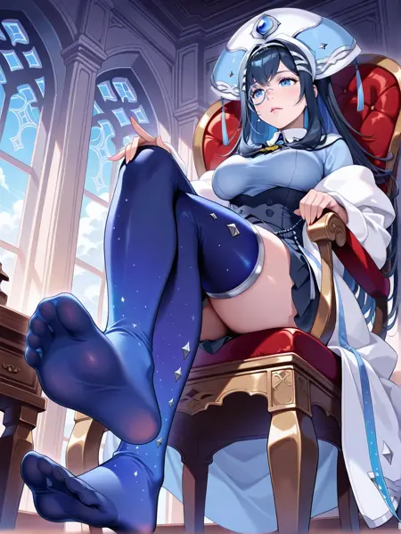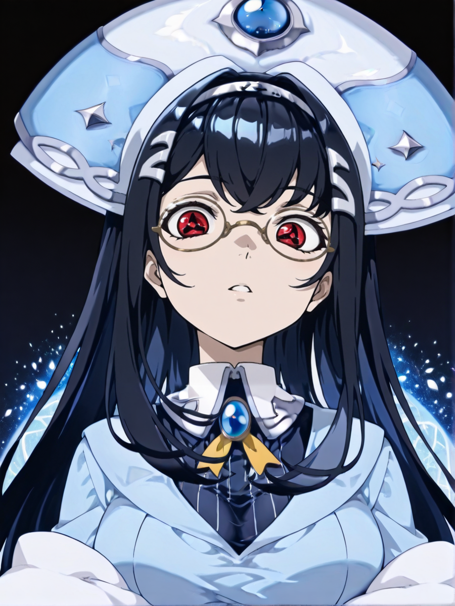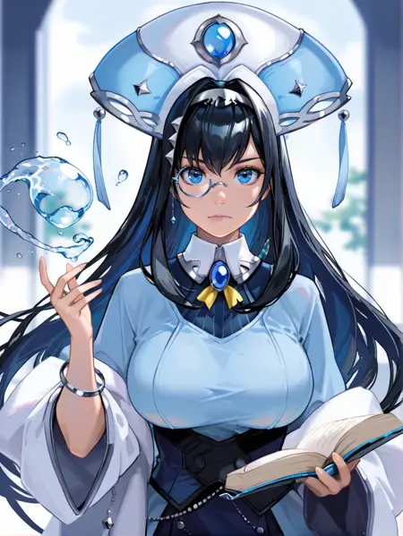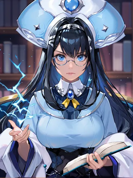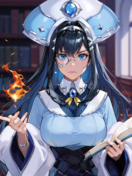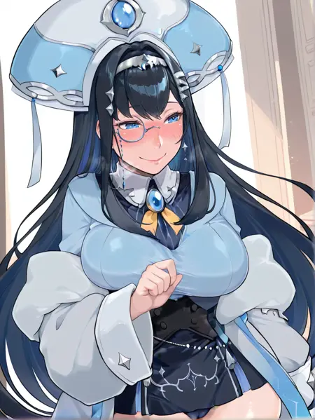 Rosalyn, 1girl, monocle,solo, phoenix crown, blue eyes,breasts, black hair, thighhighs, long hair, blue headwear, skirt,hat, hairband, blue thighhighs