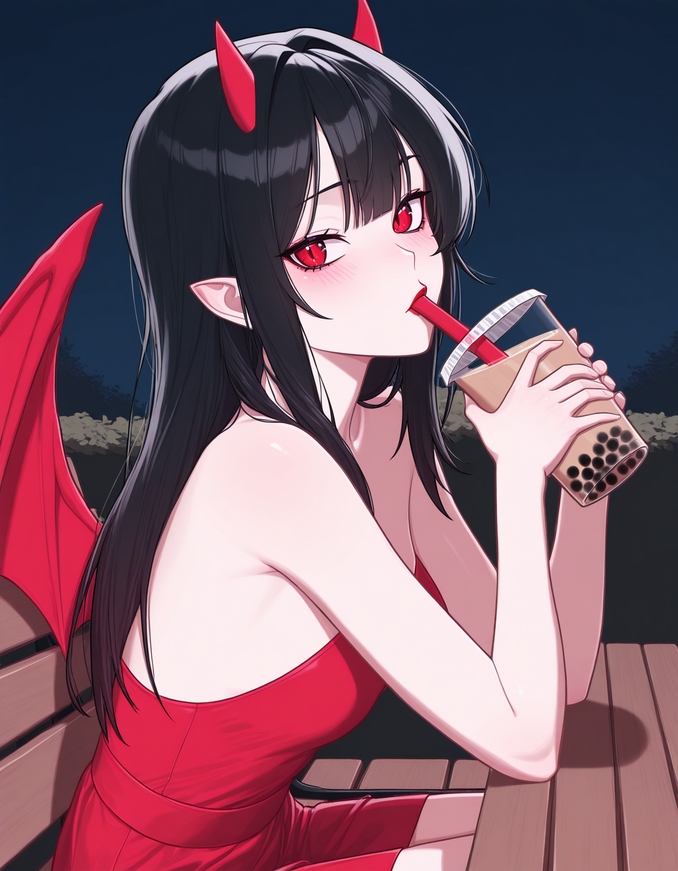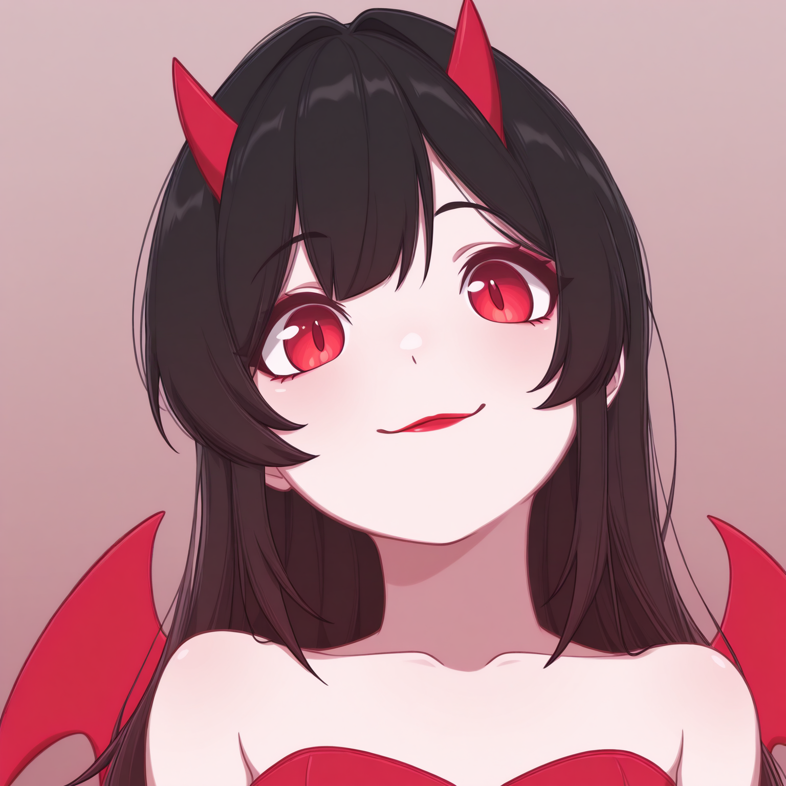 프롬프트: sh3dev1l-vkstickrs, 검은 머리, 어깨 드러난 빨간 드레스, 빨간 눈, 작은 빨간 뿔, 빨간 립스틱, 빨간 날개, 어깨 드러남, 빨간 립스틱.