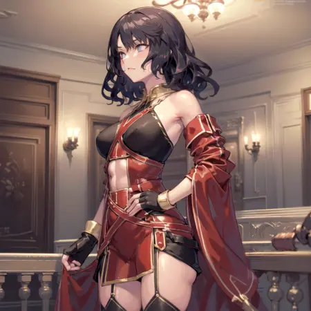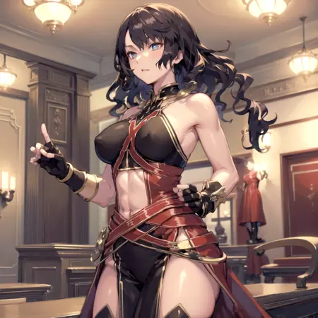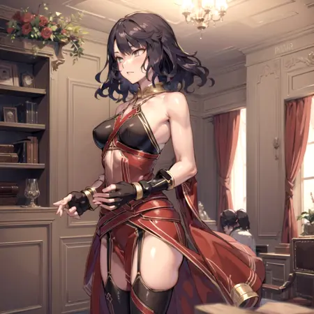 a pretty woman dressed in a tall red dress, 1girl, long hair, solo, thighhighs, gloves, black hair, fingerless gloves, indoors, room background,