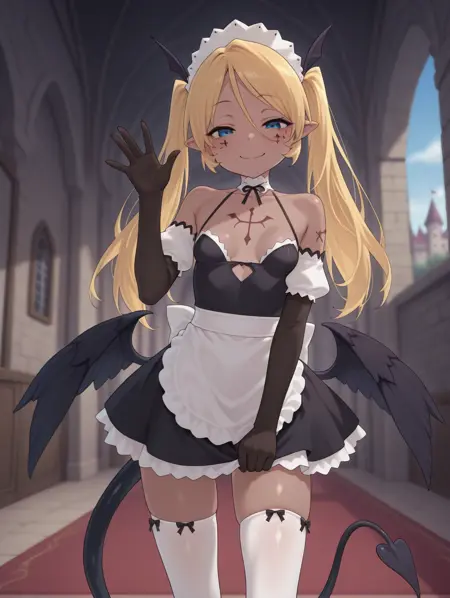 Lilithm, blonde hair, long hair, twintails, pointy ears, blue eyes, small breasts, body tattoo, facial mark, dark skin, white thighhighs, black elbow gloves, detached sleeves, nude, head accesory, demon tail, succubus, wings, black wings, low wings,