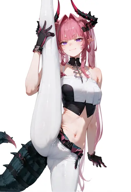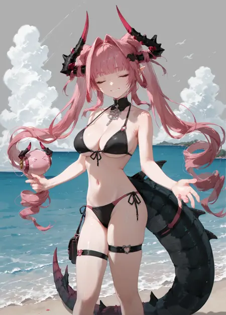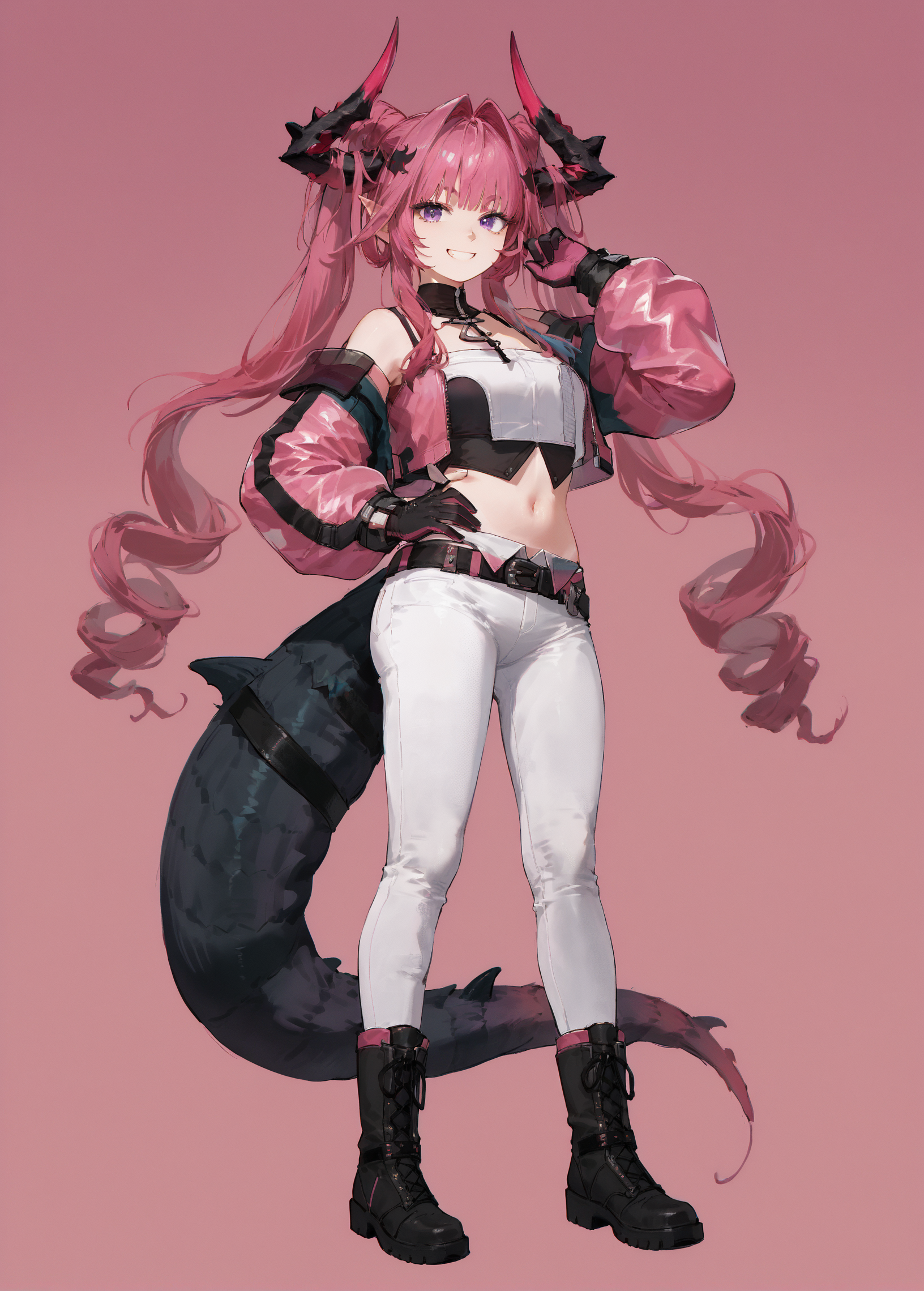Yvonne, pink hair, very long hair, twintails, bangs, horns, tail, purple eyes,