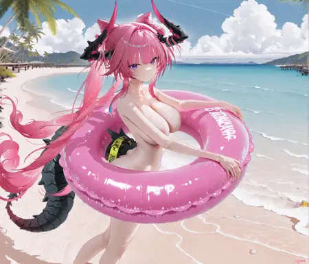 Yvonne, pink hair, very long hair, twintails, bangs, horns, tail, purple eyes,