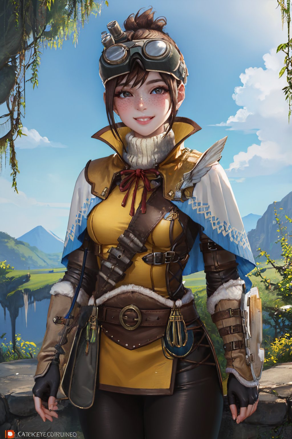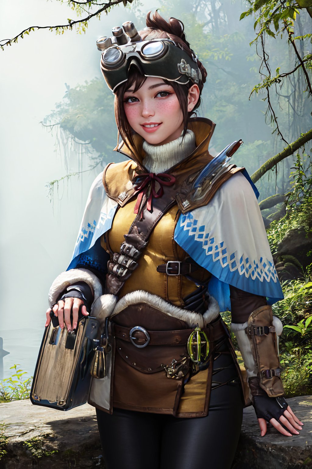 Default Outfit: goggles on head, capelet, boots, fingerless gloves