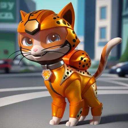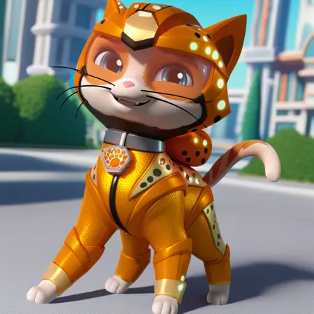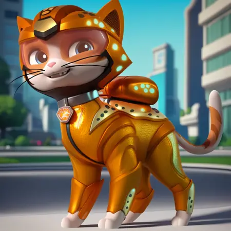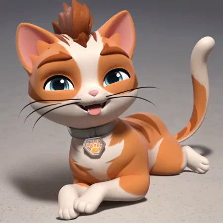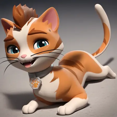 Cat, tabby cat, orange and white fur, brown hair, mohawk, thin tail, blue eyes, pink nose, silver collar, paw print tag,