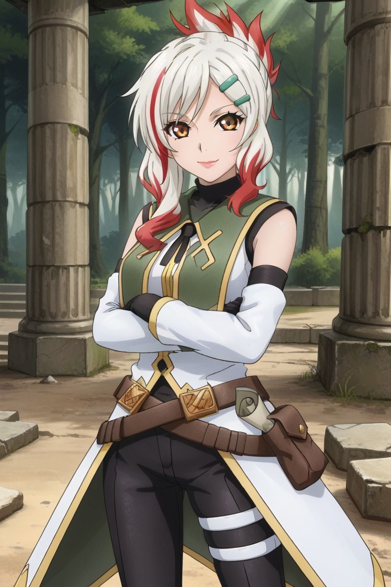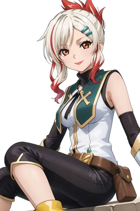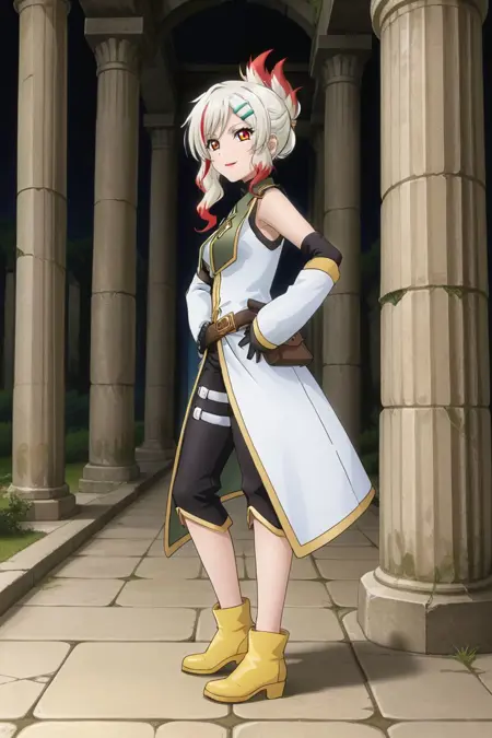 togfourier, yellow footwear, brown eyes, elbow gloves, gradient hair, hair ornament, hairclip, lipstick, multicolored hair, white hair, red highlights,