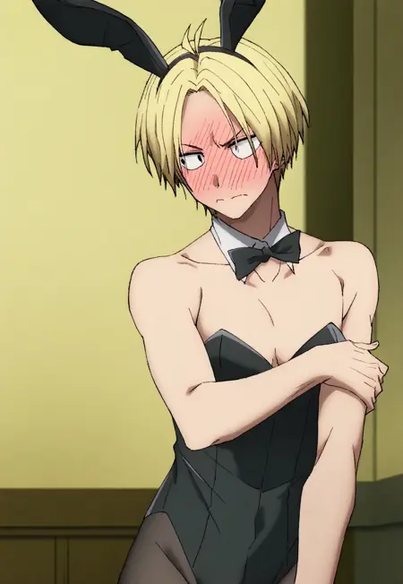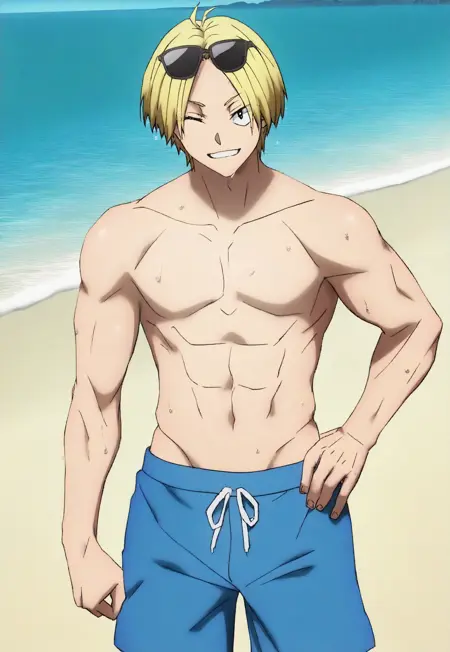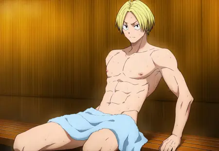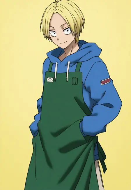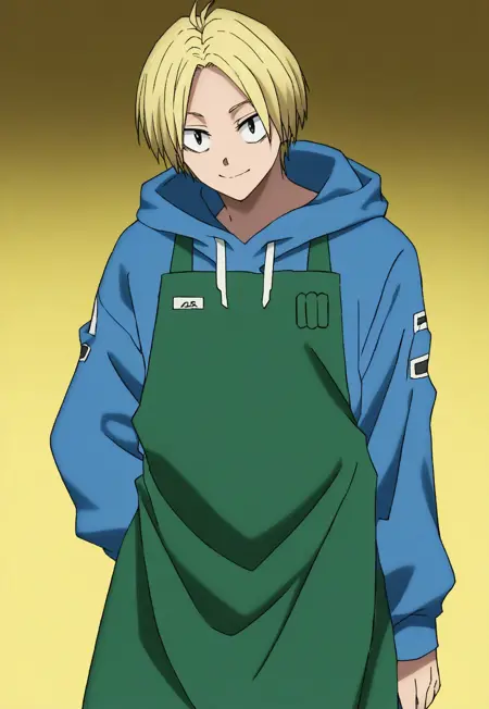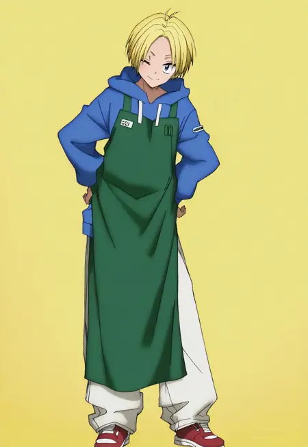 shin, shin (sakamoto days), Blonde hair, Short hair, Black eyes, blue hoodie, green apron, white pants, red shoes,