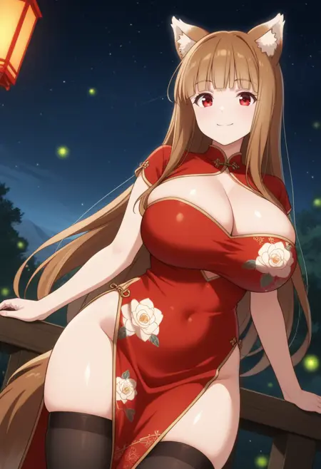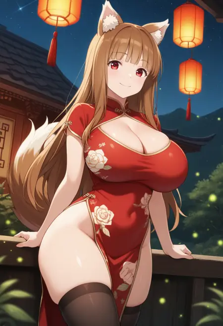1girl, Holo, wolf girl, long hair, orange hair, red eyes, smile, fang, wolf ears, animal ears, big tail, wolf tail, large breasts