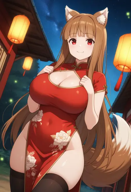1girl,霍洛,狼女,长发,橙发,红眼,微笑,獠牙,狼耳,动物耳,大尾巴,狼尾,大胸