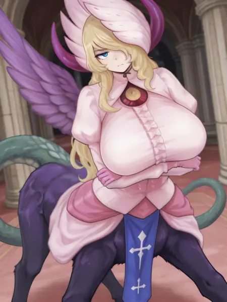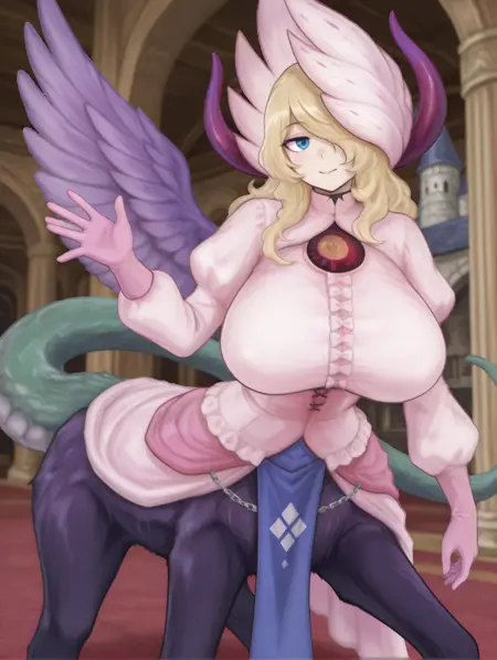Alice13, 금발, 긴 머리, 파란 눈, 한쪽 눈 가린, 한쪽 눈 위의 머리카락, 거대한 가슴, 한 개의 날개, 보라색 날개, 토어, 보라색 털, 녹색 꼬리, 모자, 분홍색 드레스, 퍼프 소매, 긴 소매, 한쪽 분홍색 장갑, 파란색 띠,