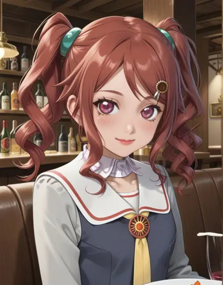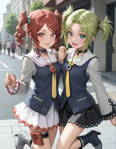 tovgauche, red hair, brown eyes, twintails, small breasts, nail polish,