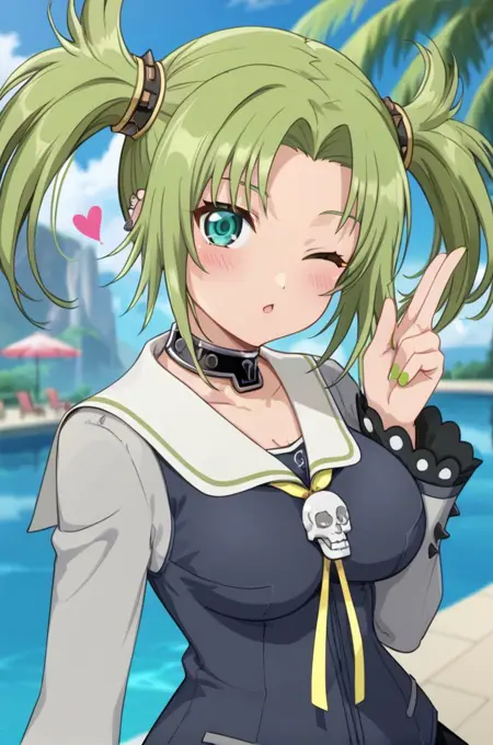 tovdroite, green eyes, green hair, short hair, side locks, parted bangs, choker, twintails, hair rings, earrings, nail polish, large breasts,