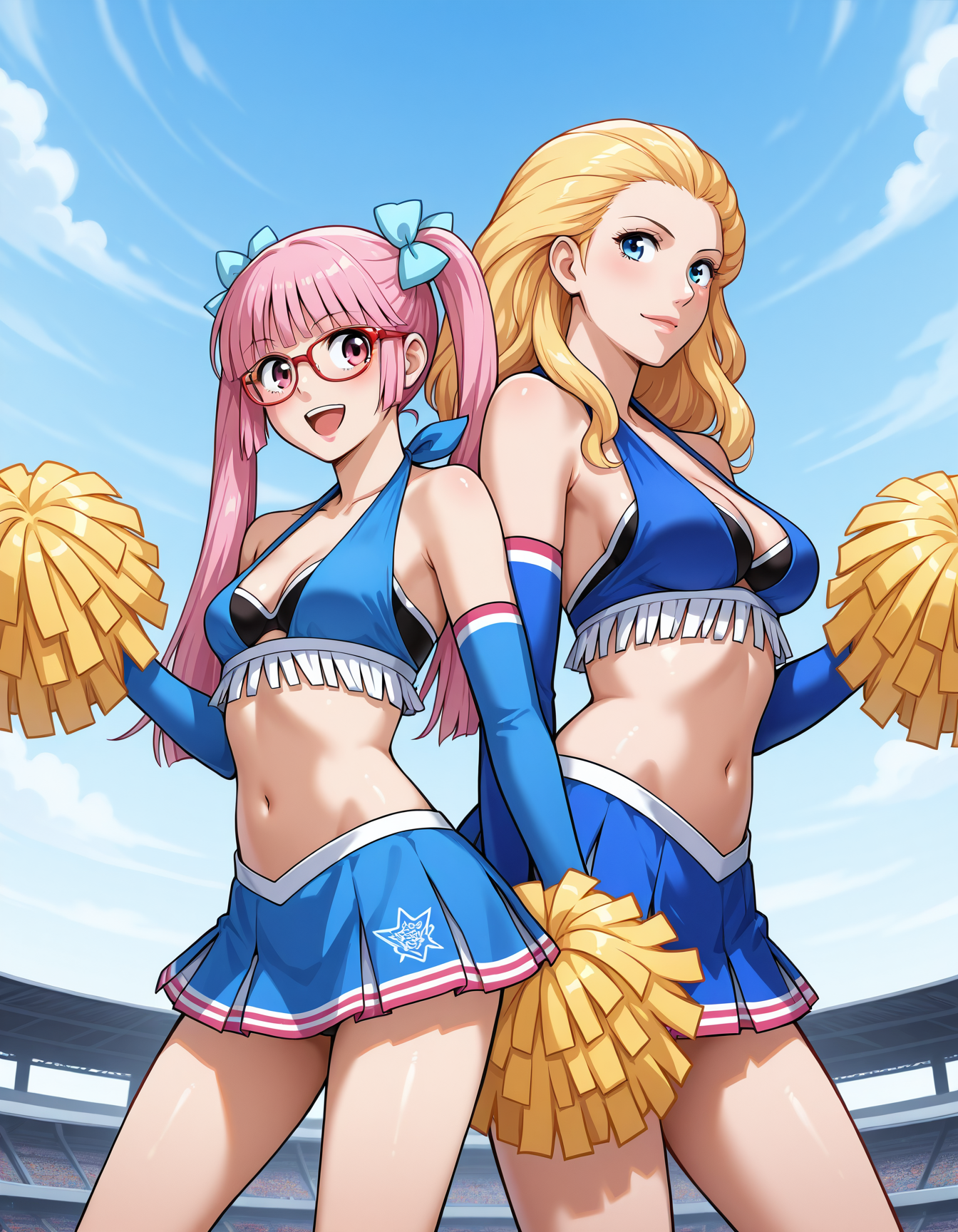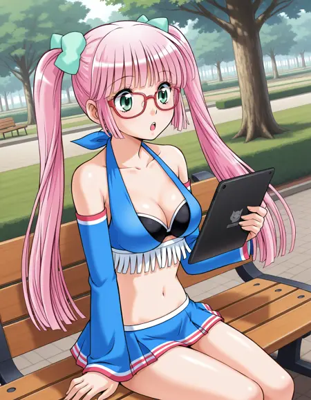 kanda aoi, pink hair, twintails, glasses, red-framed eyewear, halter shirt, bra, cleavage, detached sleeves, blue sleeves, blue skirt, microskirt
