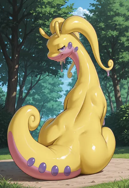 선택적: pokemon (creature), 1girl, female, feral, slug, antennae, two-tone skin, bipedal, no hair, no humans, purple eyes, yellow skin, pink underbelly, purple dots from head to neck, purple dots on tail, purple slime, slime under chin, slime under arms, full body,