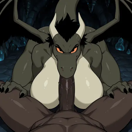 ポジティブプロンプト: DragonMLF、フューリー、フェラル、スケーリー、ドラゴン、ドラゴンの翅、角、黒髪、オレンジ色の虹彩、黒い目、濃い緑色の体、濃い緑色の鱗、長い尾