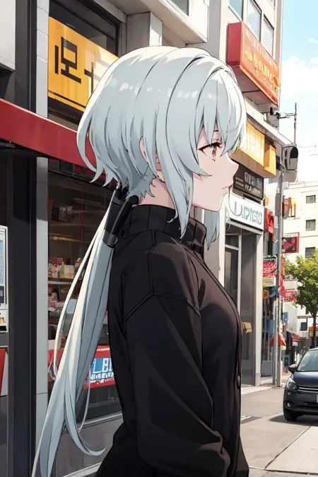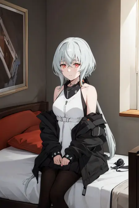 推荐提示:noir, bare shoulders, jacket, low ponytail, ponytail, pantyhose, sleeveless, off shoulder, open jacket, black jacket, black pantyhose, (white dress), necklace,
