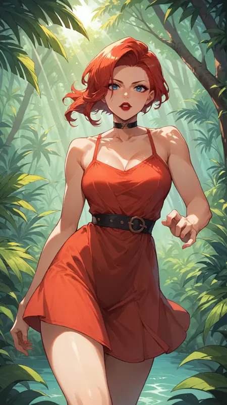 红发,侧扫发,不对称发型,蓝眼睛,黑色紧身衣,多彩紧身衣,耳机,红唇,黑色手套