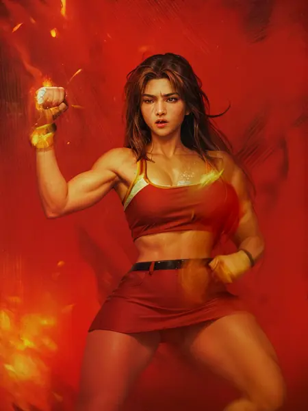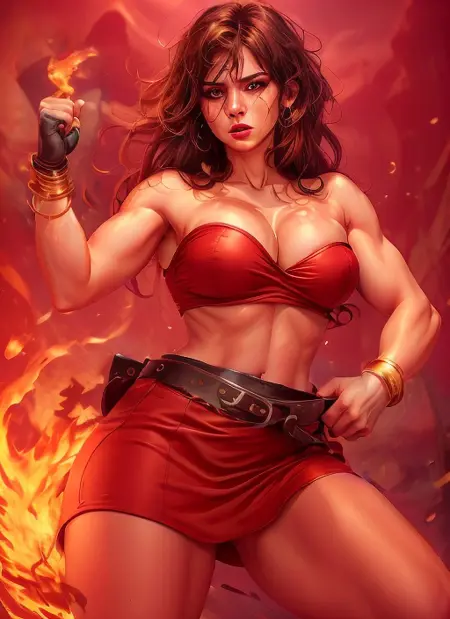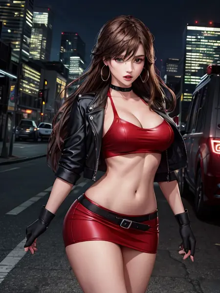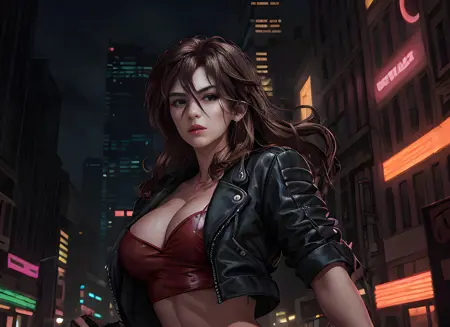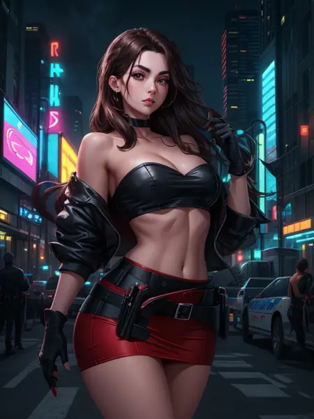 EDIT - a few words you can try in your prompt and used while training. I forgot to mention them, sorry: brown hair, red skirt, miniskirt, red top, strapless top, leather jacket, black jacket, belt, red boots, fingerless gloves, mole, mole under mouth (it was there but I admit I wasn't able to replicate her mole). Feel free to try variations of those, like "blue skirt" and so on. Gloves on the negative prompt gives result, as you can see in the 3rd example.
