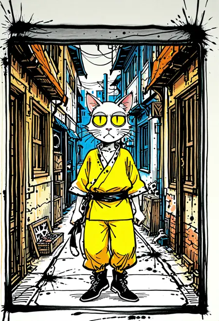 动态墨水表现: 融入溅洒效果与抽象线条艺术,还原斯泰德曼无拘无束的技法。