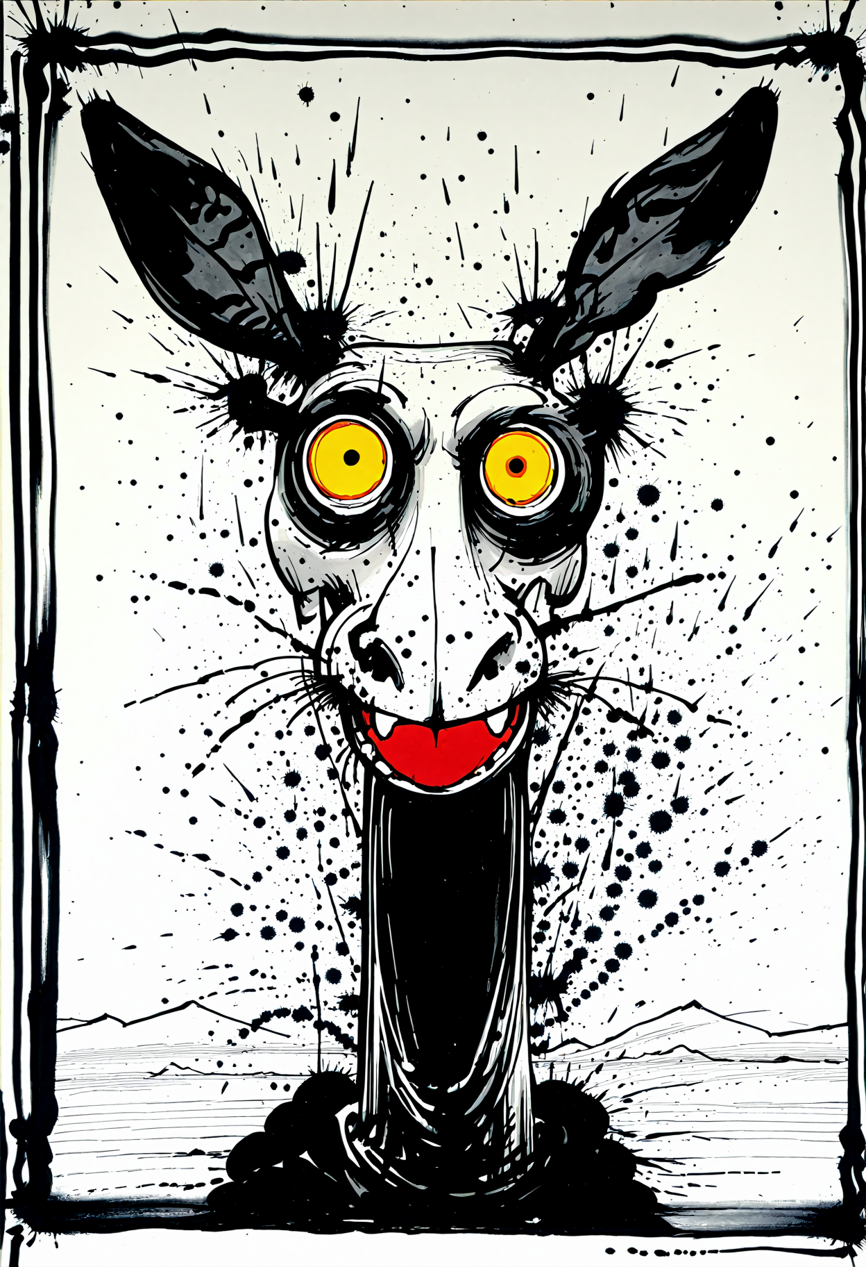 传统媒介、墨水溅洒、混乱背景、怪诞艺术、高对比度、扭曲比例、富有表现力的面孔、超现实主义、讽刺画、抽象线条、晕染墨迹