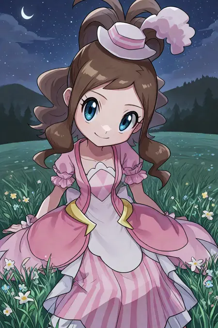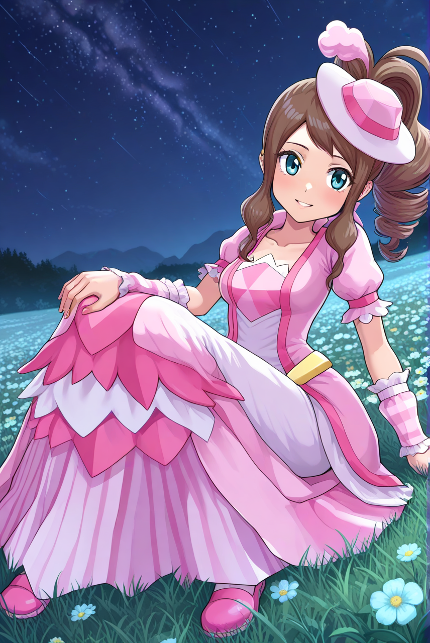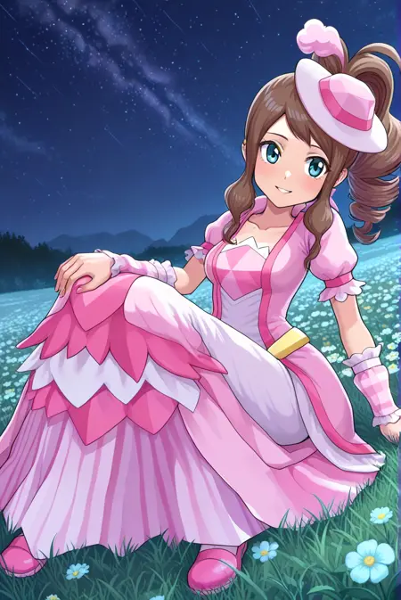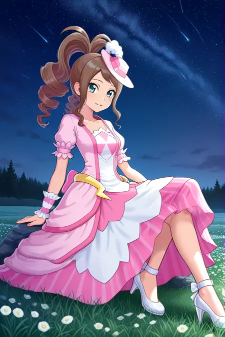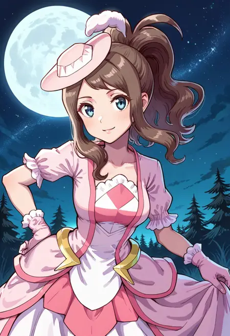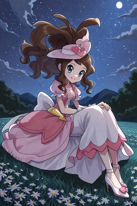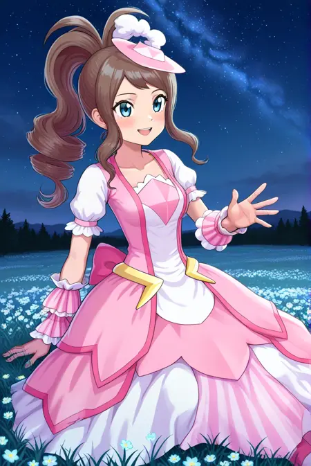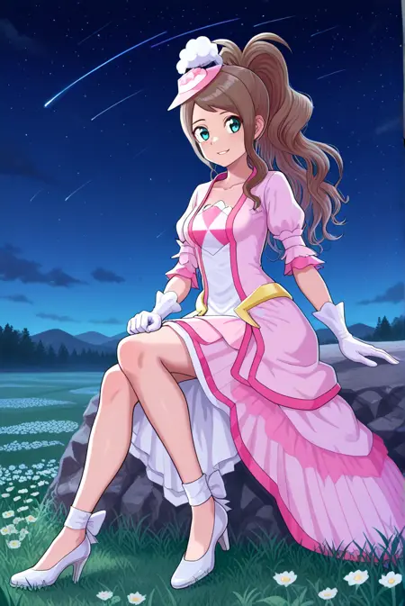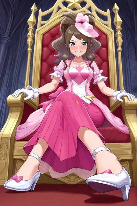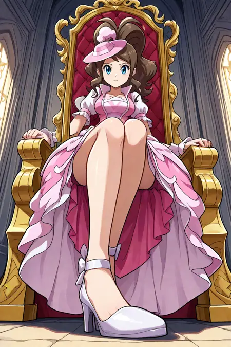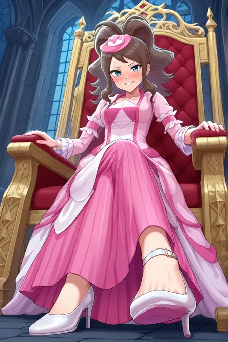 hat, pink headwear, pink dress, gown, collarbone, long sleeves, frilled sleeves, sleeve garter, shoes, white footwear
