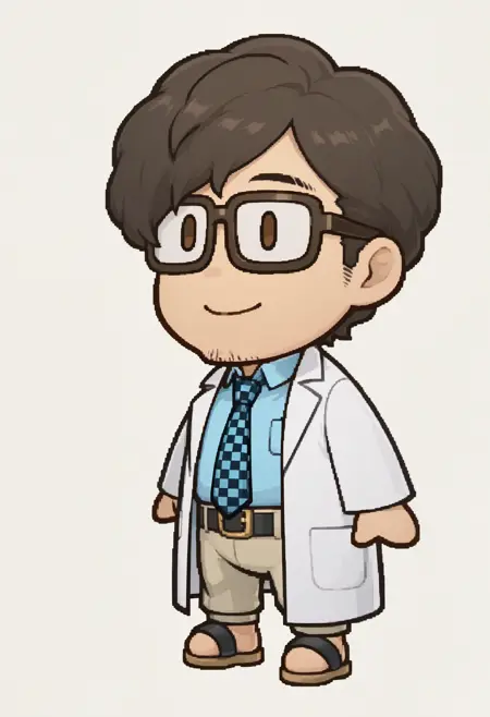 - 默认外观: 马鲁基,短发,棕发,棕眼,戴眼镜,山羊胡须,白大褂,有领衬衫,浅蓝色衬衫,格子领带,挂绳,黑色腰带,棕色裤子,凉鞋