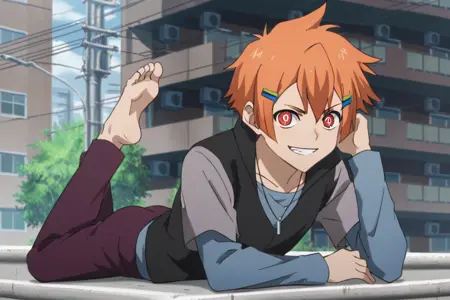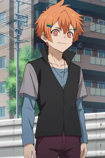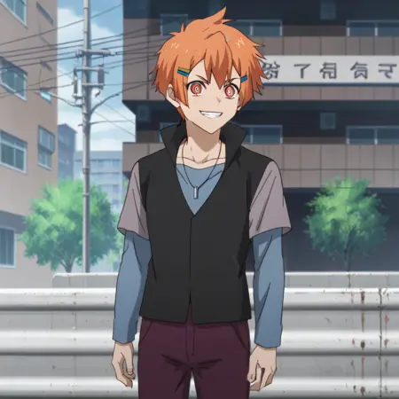 提示:男性,橙色头发,发饰,发夹,红色眼睛/疯狂眼睛,符号形状的瞳孔,项链,珠宝,黑色背心配灰色袖子,翻起的衣领,蓝色长袖衬衫,层叠袖子,短袖外罩长袖,紫色裤子,黑色便鞋,室内(VIP室),室内(教堂),室外(教堂),室外(城市/电线杆/电线)