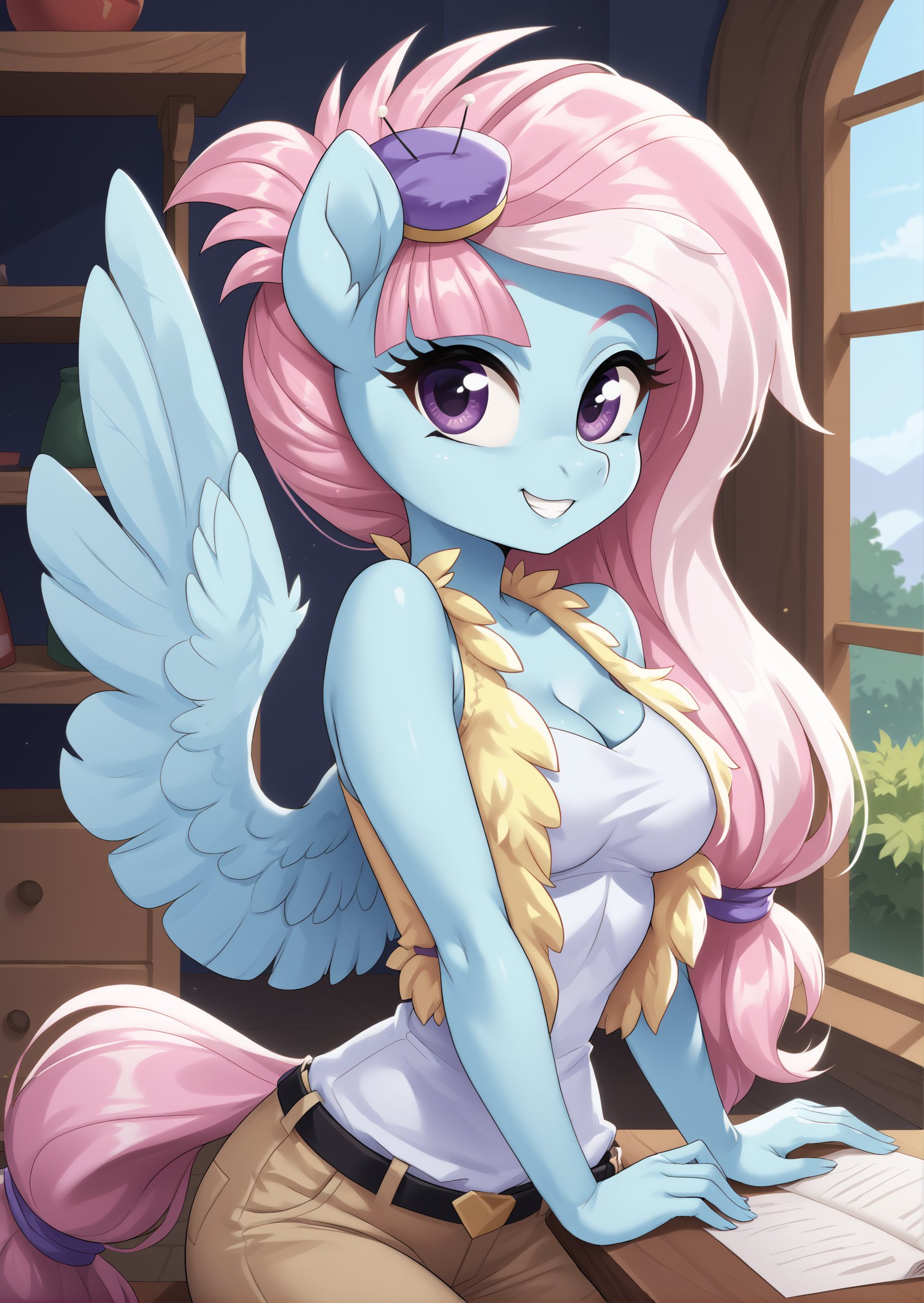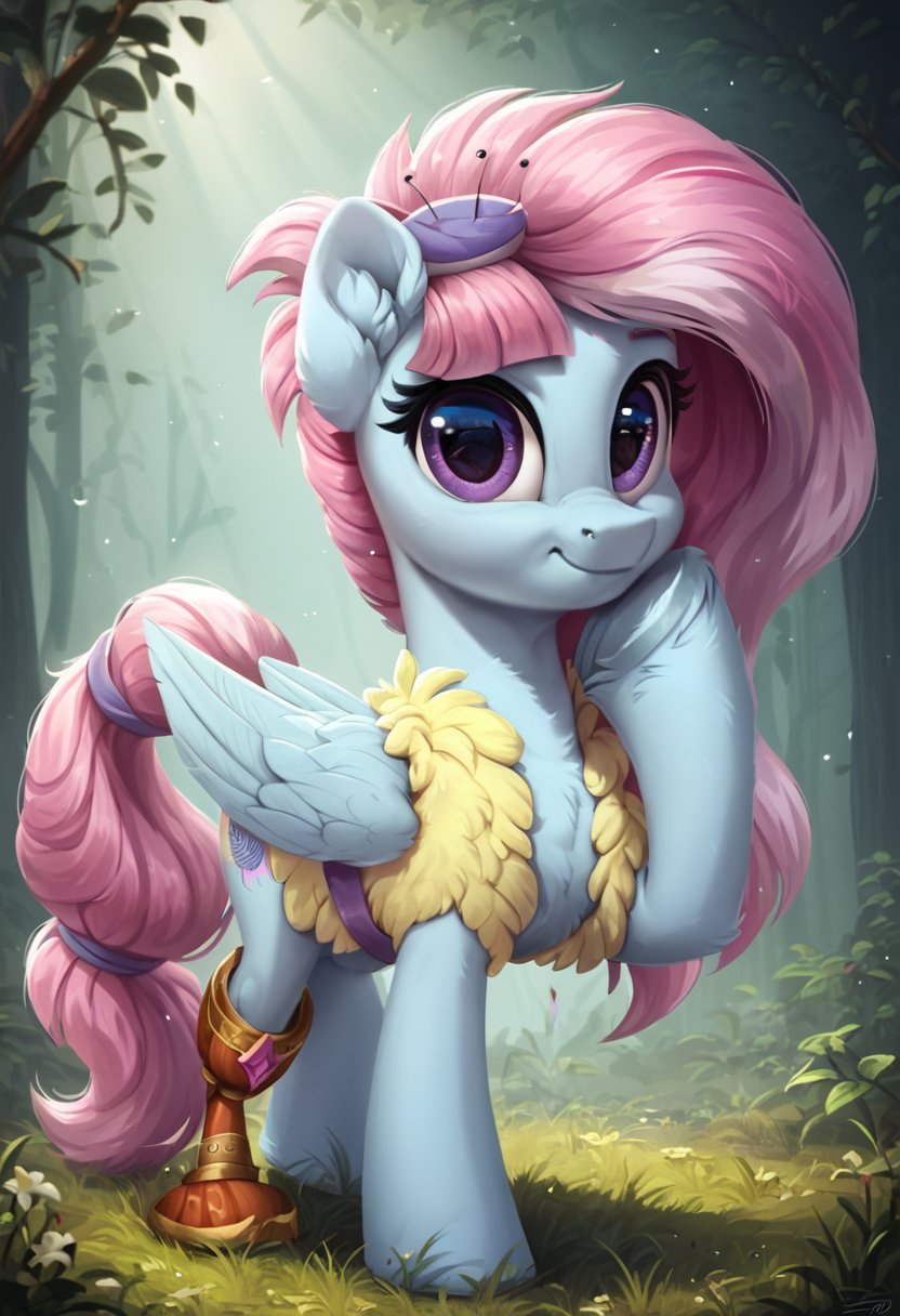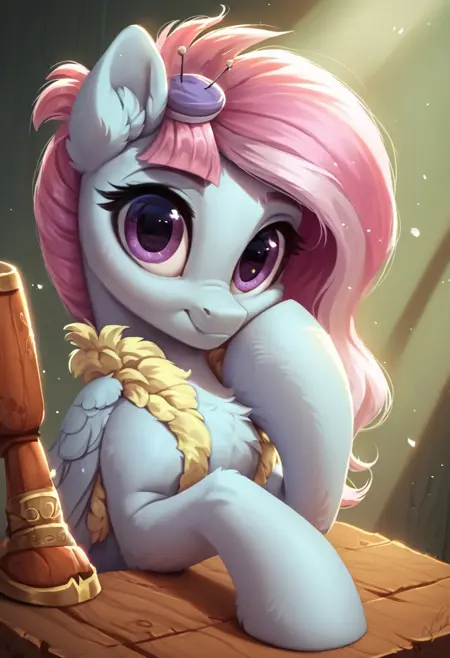 pegasus, light blue body, long fluffy pink hair, styled in such a way that it resembles a flowing mane and tail, tied with purple ribbons, purple eyes, he wears a yellow fluffy vest, (one of his back legs is replaced by a wooden prosthesis with decorative details. On the side is visible a small round insignia in pastel colors, on the head a small decorative object like pins a small red heart with an arrow on the side
