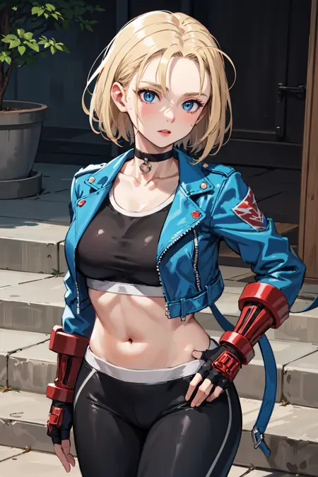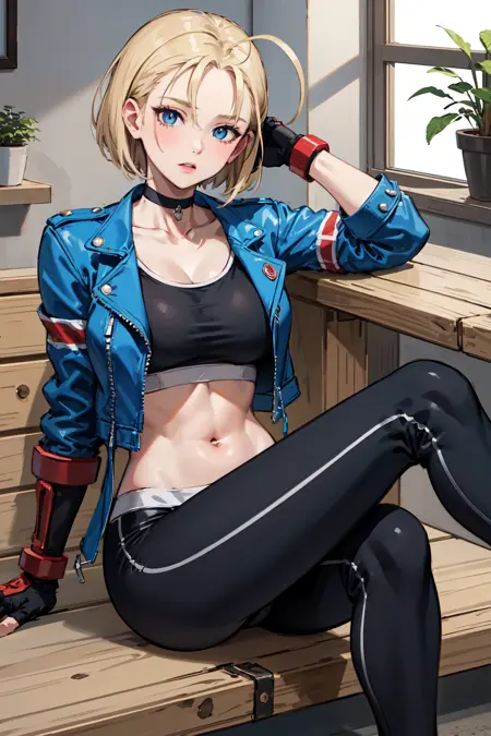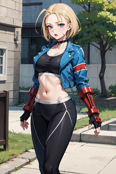 아우트핏3 (재킷)cammy white, short hair, antenna hair, blue eyes, scar on cheek, large breasts, black choker, collarbone, blue jacket, cropped jacket, open jacket, sports bra, midriff, fingerless gloves, black gloves, black pants