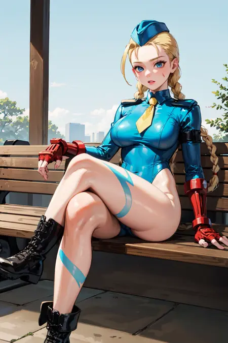 아우트핏2cammy white, twin braids, long hair, blonde hair, antenna hair, garrison cap, blue headwear, blue eyes, scar on cheek, large breasts, yellow necktie, (blue leotard:1.1), long sleeves, fingerless gloves, bodypaint