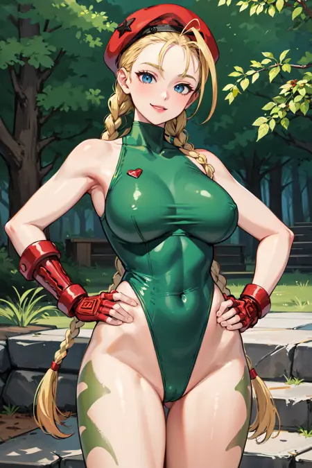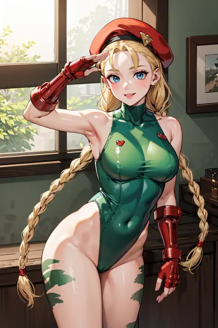 아우트핏1cammy white, twin braids, long hair, blonde hair, antenna hair, beret, (red headwear:1.3), blue eyes, scar on cheek, large breasts, green leotard, sleeveless, red gloves, fingerless gloves, camouflage