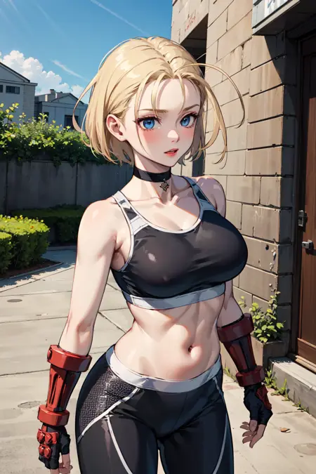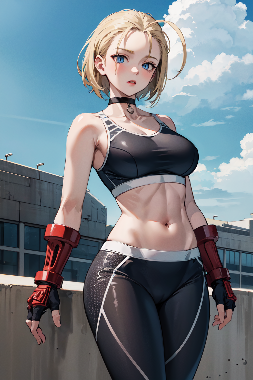 아우트핏3 (재킷 없음)cammy white, short hair, antenna hair, blue eyes, scar on cheek, large breasts, black choker, collarbone, sports bra, midriff, fingerless gloves, black gloves, black pants